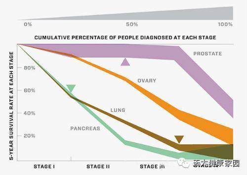从图2可以看出,许多癌症的存活率是相似的,秘诀就是在癌症的早期诊断出来。早期发现的话,大多数接受低风险手术的患者的生存率接近90%;但是在癌症晚期发现的话(III期或IV期),治疗方案只能选择毒副作用极强的放疗、化疗等,存活率会随之急剧下降。现在看来,第一段中提出的问题答案已经很明显了。战胜癌症真正的途径是做好早期检测,选择针对癌症激活途径的靶向性治疗方案。