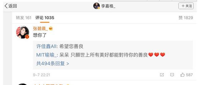 不过看起来,李嘉格和张碧晨应该是一起的,因为张碧晨给她评论了。