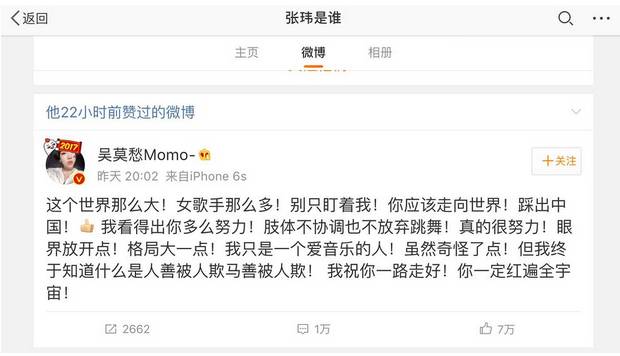 张玮点赞了吴莫愁的微博:
