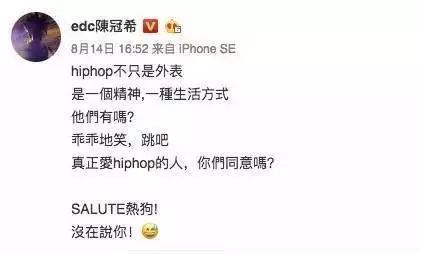 此后还在在个人微博上暗讽《中国有嘻哈》根本没有Hip Hop 精神。