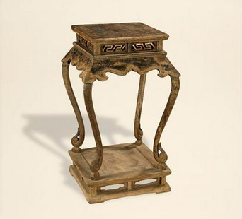 说明:此几以白木作胎,通体髹黑色大漆,风格高古,漆层厚实。由因年代久远,漆面剥落,但仍保留着独特的韵味。整件家具上下协调一致,形如台座状,分为三部分组成。上层几面作方,四边攒框,中间饰面板。束腰与肩部合为一体,如意云纹肩饰做为牙板,并起沿线,之上又于镂空开光处刻琢回纹锦地。腿足曲折,从上至下内收外翻,最终承于双层开光托泥上。双层台座,厚薄适中,承托四足,如此做法颇有新意。但与整体配搭融合,并未有多余、不妥之感。整器颇具明代风韵,乃大美之物。