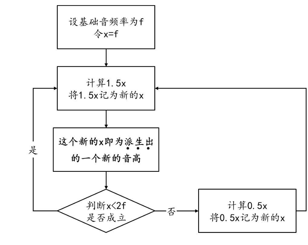 吴钊先生认为,骨笛中不同音高之间的关系很接近我国春秋时期著名的三分损益律。所谓三分损益律,就是用一个基础音来派生出一系列其他新的音高,其步骤如下:
