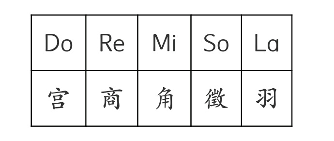 按这个方法,设“宫”为基础音,依次派生出的前4个音恰是“徵”、“商”、“羽”、“角”。