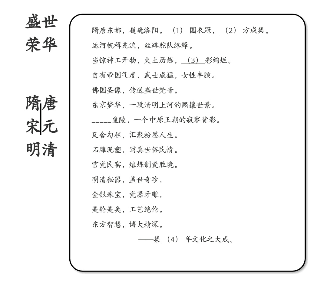 “三”“八”“千”“万”是中国文化中经常使用的数字,在四个空格中填入这些数字,反映的是学生对传统文化的熟悉程度。比如对中原文化历史长度的表述“千年”是最合理的,“八方”是我们对于“四面八方”的简短表述。有些学生会在这道唐宋元明清展区的文字中选择“三国”,其实也是对于历史常识的一种缺失。同样,洛阳在不同朝代曾经是东都,也成为过西都,那当它是西都时,东都可能在哪里呢?这是很简单的方位常识,也能让学生感受到历史很有趣。