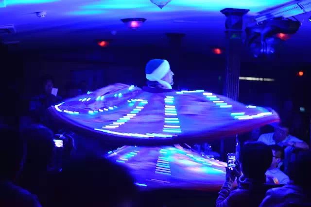 在埃及的一些宗教节日里,民间也会有很多苏菲舞的活动。舞者无一例外全部是男性,包括歌者和鼓者。旋转舞者所着服装的色彩非常鲜艳,特别是圆蓬长裙至少有三层以上,有时在旋转的过程中还会加上新的蓬裙。开罗观看苏菲舞最著名的地点是在哈利利市场,爱资哈尔清真寺旁边的固力宫。穿过热闹非凡的市场,穿过虔诚的人们,贴着清真寺的巷子向里走,就到了固力宫。里面宽敞空旷,就像阿拉伯城堡一样,可以坐600人左右。