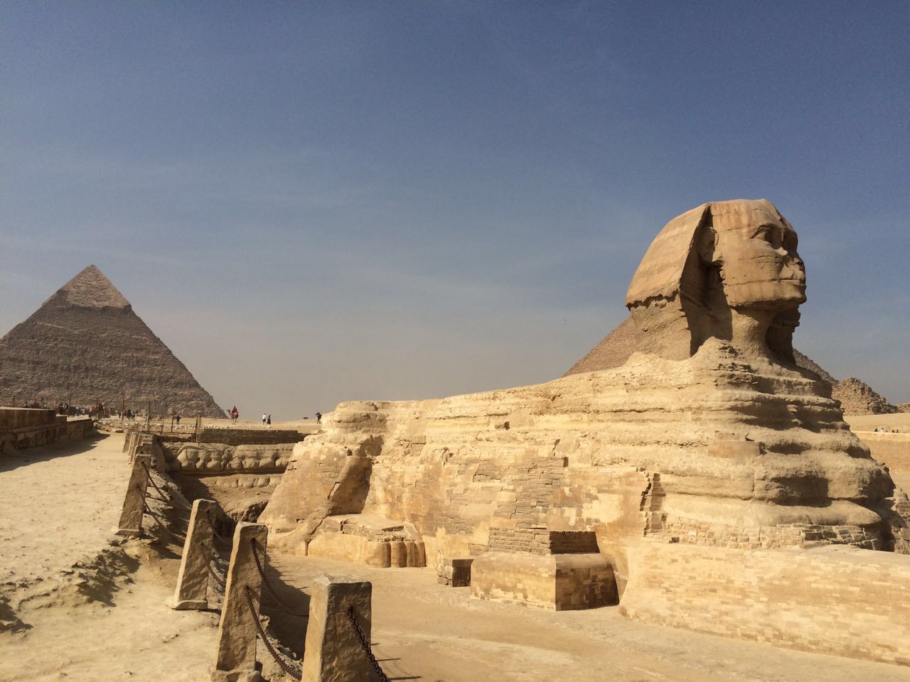 金字塔周围的附近匍匐着狮身人面像,据说这是一块弃石,于是工匠索性就把它雕刻成为了法老头和狮子身的雕像,展现法老拥有人的智慧及狮子的健壮体魄,这听起来颇像某个动画片的探长豹的速度、熊的力量、鹰的眼睛那个。。。按你胃(anyway),古埃及人对法老的神话简直就只有你想不到的,没有他们编不出来的故事!这个失身了的人面像(人妻咆哮:你这个人渣,不要乱讲!!),传中中鼻子是因为拿破仑拿去练习枪法而破坏掉的,其实拿同学背了很久的骂名,这个鼻子呢,是一个宗教极端分子用刀砍掉的,那么问题来了,为什么他可以砍这么高呢?因为。。。他是姚明啊。。。好了,joking啊!因为当时黄沙漫漫,遮住了失身人面像的下半部分,因此站在地上就可以猛砍鼻子了。。。如果买了票还可以进入金字塔的肚子里面哟!
