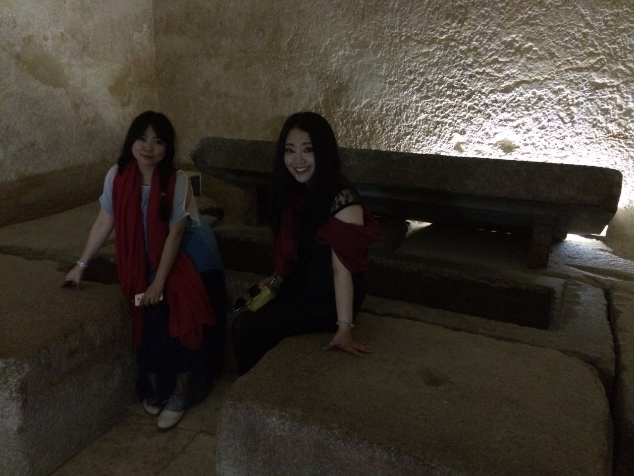 进入金字塔内部对身高有要求,因为进入墓室的甬道狭窄又矮,高个子的同学们基本上是要卑躬屈膝进出的,加上道路又很陡峭,穿了有点跟的火兔简直举步维艰,加上金字塔里面通风非常不顺畅,如果身体不太好,心脏有问题的花粉们请谨慎选择。进去就可以看到石头的墓室,因为省钱,我们选择了比较便宜的小金字塔。(怎样?!我们就是当红女穷屌!)