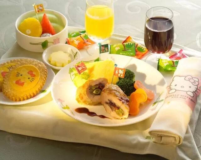 飞机餐的主菜、甜品、调料、餐具甚至纸巾都是全套的Kitty,先不论味道有多么好吃,仅仅是这可爱到爆炸卖相,已经足以让不少女生为了飞机餐而去坐飞机了吧!