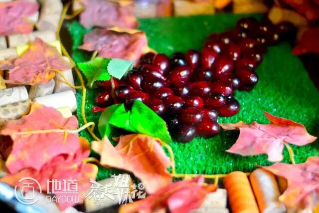 桌椅都很有风格,桌子的中空位置放上了塑胶的葡萄和树叶,并摆上了用过的酒瓶木塞。
