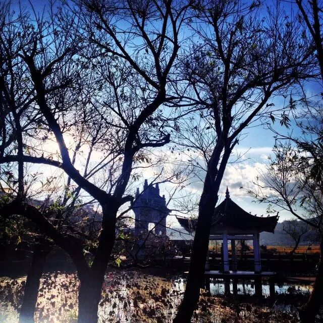 荷花围绕的凉亭,夏天是这样的景致呢?冬天显得有点萧瑟了~