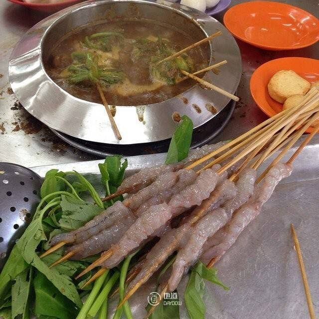 虾都剥好了,用竹签串起来,新鲜的海虾,放到沙爹锅里,味道超赞!