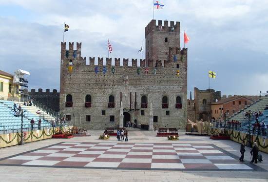 意大利的东北部,离维琴察市不远,有一个叫马洛斯蒂卡(Marostica)的小镇。小镇依山而建。整个小镇由中世纪的城墙与古堡包围着:红色城墙古堡与青翠的山峦形成了鲜明的对比,更加显得娇小玲珑,仿佛是一颗红宝石被镶在了翡翠之间。