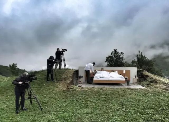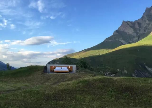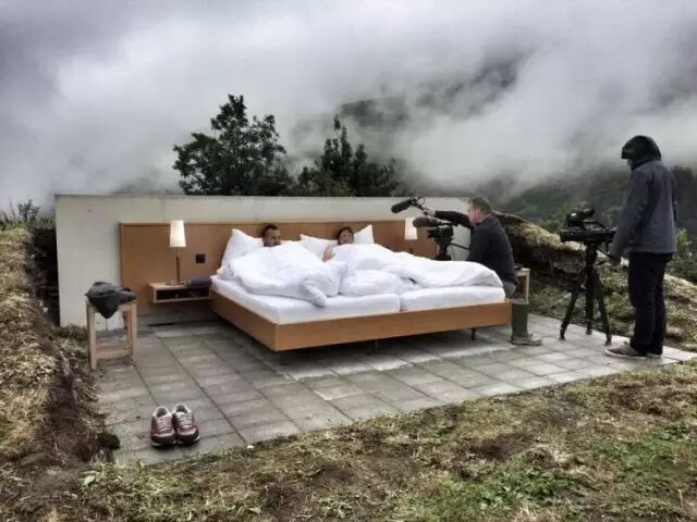 不过,如果你是在登阿尔卑斯山的时候,看到一张床,不要惊慌,不要害怕!它真的是一家旅馆,叫作「Null Stern」,只不过,这间房没有墙。