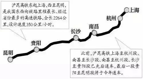 时速最高达350公里,从昆明到上海只需10小时,到杭州6小时,到长沙4小时,到曲靖33分钟,到玉溪29分钟......