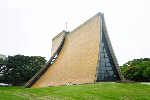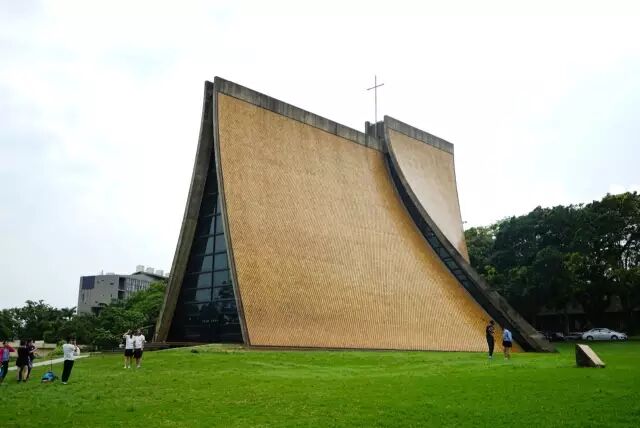 路思义教堂是一座非常特别的建筑,在大片草坪上遗世独立,很多学生在拍照。这是著名建筑大师贝律铭的作品,刚开始创作的时候是一个歌德式的建筑,但是考虑到台湾常年有地震,最后设计成现在人们所能看到的类似船底的模样,远远看去,很像一双祈祷的手。