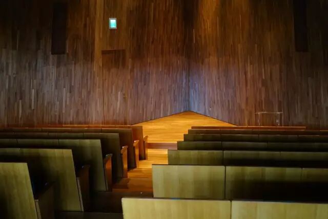 进门就能看见三角形的演艺室,美术馆内的墙体均匀分布这样的小洞,无用时是建筑特色,需要时可以悬挂画作。
