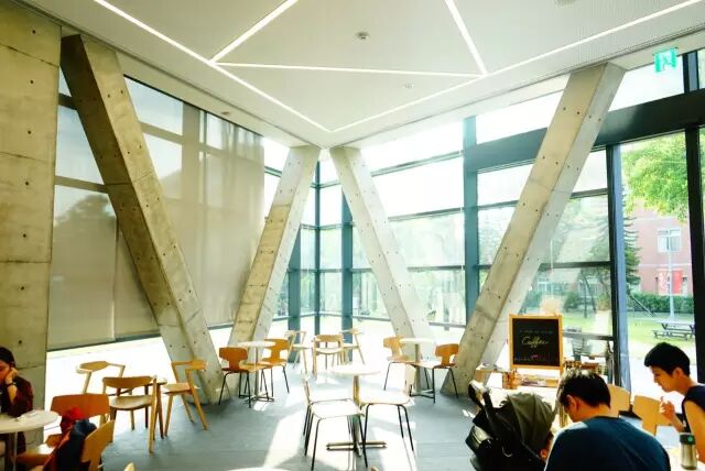 美术馆纪念品购买点的小咖啡馆,采光很好,两个三角形看起来好像一个“W”。这是安藤忠雄在台湾第一个艺术作品,却不是第一个设计的作品,为什么?你亲身来就能知道这个遗憾的由来了。这里,同时是世界上第一座在高校校园里的安藤忠雄美术馆。