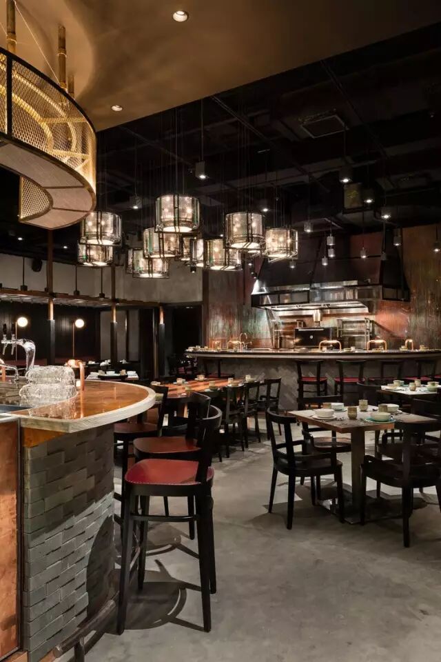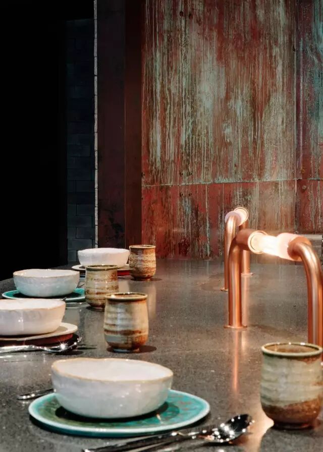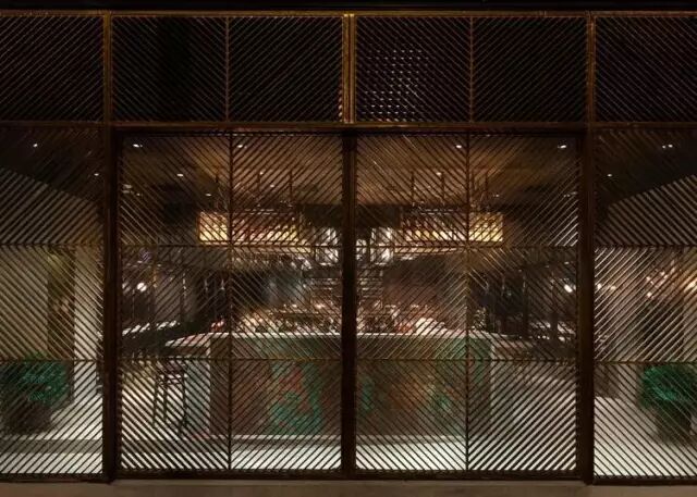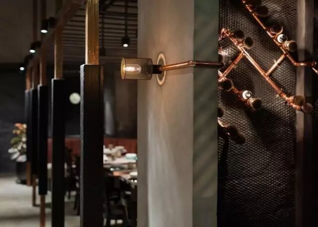 在Joyce Wang看来,门口的铜招牌和巨型工业门是她最喜欢的部分,金属原材料的外墙既与众不同,又能融入临近街区的餐饮铺面。进入餐厅,则是一个有趣的、意想不到的空间。