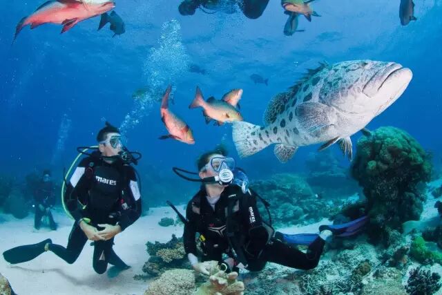 鳕鱼洞是世界上最著名的潜水地点之一。为什么?因为你能看到鳕鱼并喂它巨大的土豆,这使得他们格外的友好和上镜。鳕鱼洞位于带状礁(潜水员的天堂)的北部,是有点难找,但这也是的它更为独特。