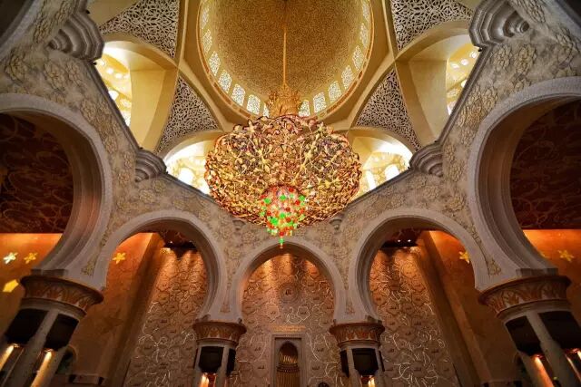 阿布扎比大清真寺,有82个圆形穹顶,主穹顶高85米,如果你抬头,可以看到大殿中有7盏水晶吊灯,所有的水晶度来自施华洛世奇,最大的一盏重达9吨,德国造。