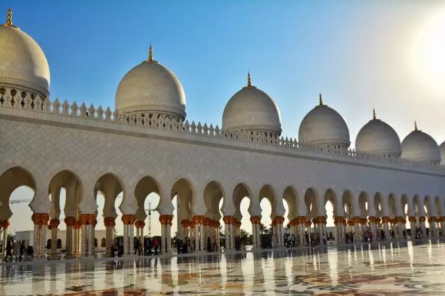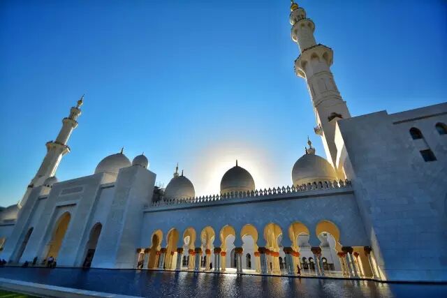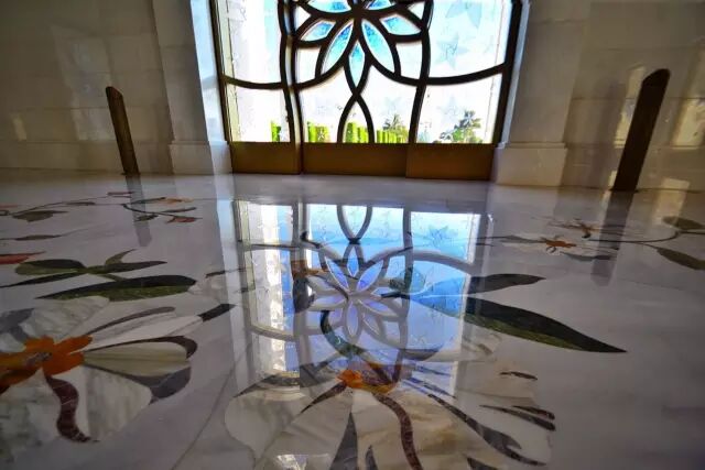 大清真寺的外墙全部由来自希腊的汉白玉制造,并且将宝石和贝壳嵌入大理石,作为花纹,所有的金黄色都是货真价实的黄金。据说,这座清真寺,耗资55亿美金。
