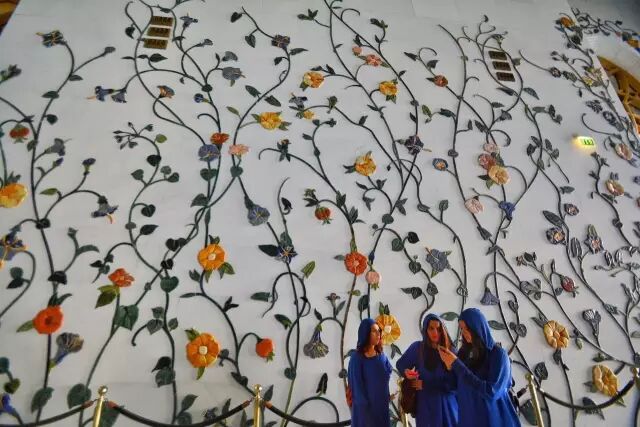 长长的走廊,旁边都是围绕着藤蔓的柱子,柱头是真金。在伊斯兰教教义当中,天堂是有着潺潺流水、百花盛放的地方,沙漠地区,很难长出花来,于是就用色彩的玛瑙、水晶、宝石,砌成了各种花卉。
