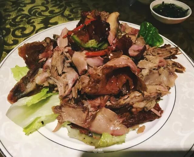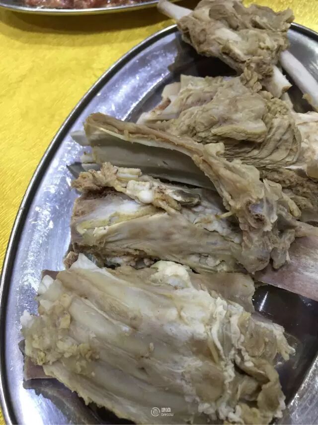 主角来了!这家是采用窖烤的方法,不是常见的那种架烤。优点是热度均匀烤的外酥里嫩,缺点是羊油都还留在体内会比较油腻。一只羊可以撕出这样的七大碟,我们一行11人吃不完~