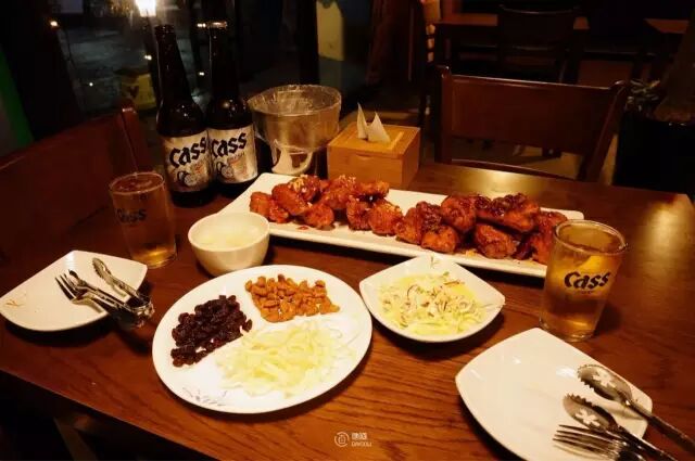 店内主要是卖炸鸡啤酒和一些小吃..坐着三三两两喝酒聊天的韩国民众..装修风格十分温馨..