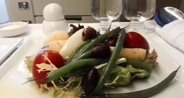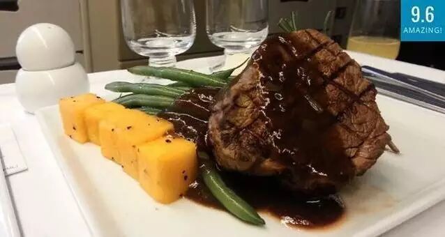 主菜是红酒菲力、清蒸鳕鱼,烤火鸡肉和烤猪肉四选一,我选择了牛排,清新的豆角上淋着特制的红酒黑椒汁,味道堪比高档新餐店,在飞机上有这样的体验简直难等可贵。