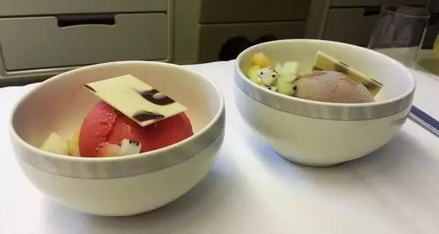 饭后甜点呢则是哈根达斯冰激凌,可以要两个口味……很满意,这次吃的超饱,大胃王才能承受下如此高能的一顿饭,虽然新加坡航空贵一点,但是这个体验还是非常超值的。