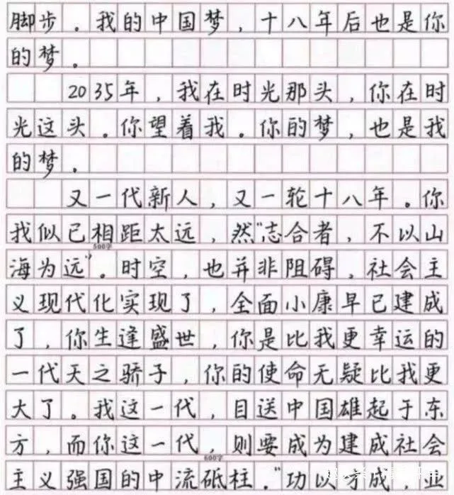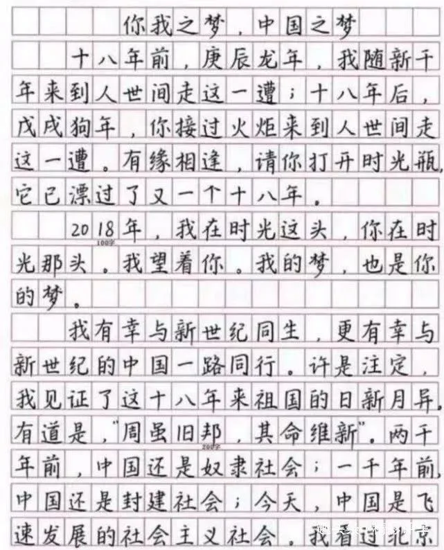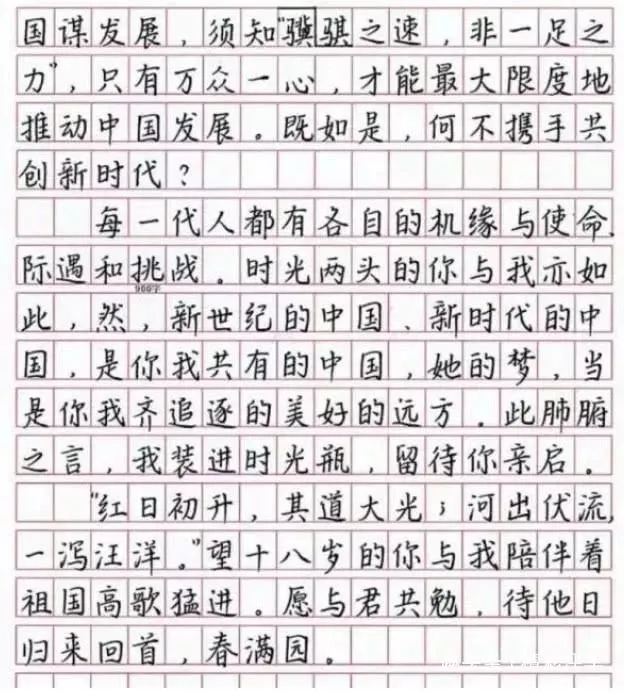 全文都描写了新世纪的中国容颜,并且有美妙的瞻望之情。之所以说这篇文章是“印刷体”高考作文,是由于整篇文章首先是没有一个涂改,而且字迹大小,距离都很恰当,和印刷出来的字体没什么区别。这样一份有才气又字迹很好的作文自然是赢得了阅卷教员的喜欢。