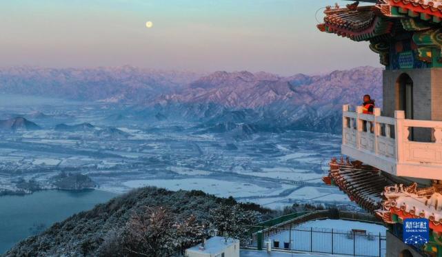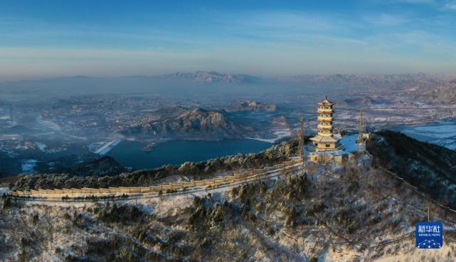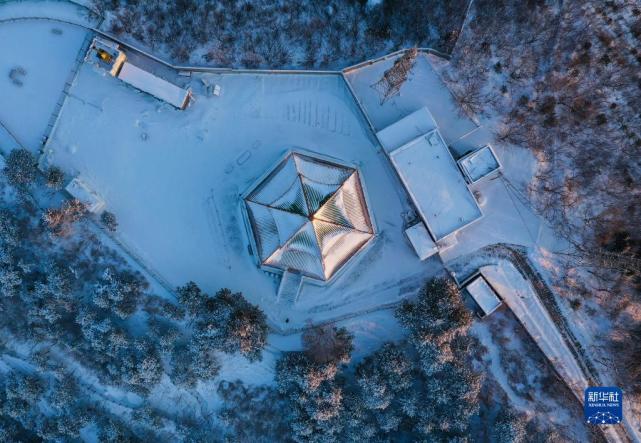 经过前一夜的风雪,北京市十三陵林场管理处蟒山瞭望塔布满积雪(3月19日摄,无人机照片)。新华社记者李贺摄