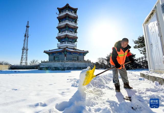 宋臣在瞭望塔外的院子中清理积雪(3月19日摄)。新华社记者李贺摄