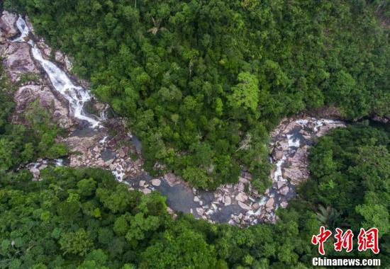 海南热带雨林国家公园位于海南岛中南部,跨五指山、琼中、白沙、昌江、东方、保亭、陵水、乐东、万宁9个市县,约占海南岛陆域面积的七分之一,拥有中国分布最集中、保存最完好、连片面积最大的岛屿型热带雨林。图为航拍吊罗山雨林溪流。