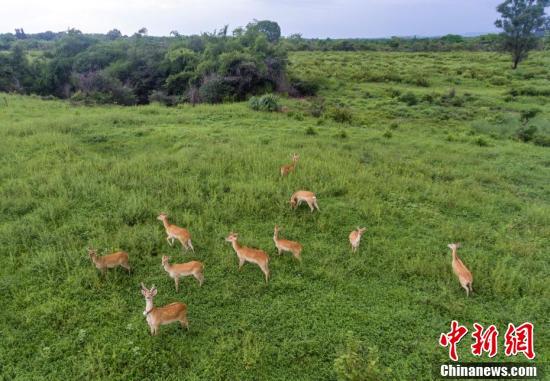 航拍海南东方大田国家级自然保护区内,成群的海南坡鹿在草地觅食。骆云飞