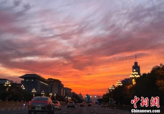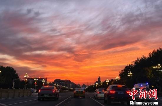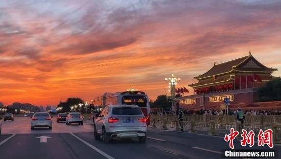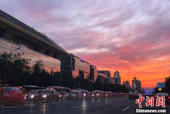 10月5日,傍晚的北京出现绚烂晚霞,天幕披上迷人色彩。