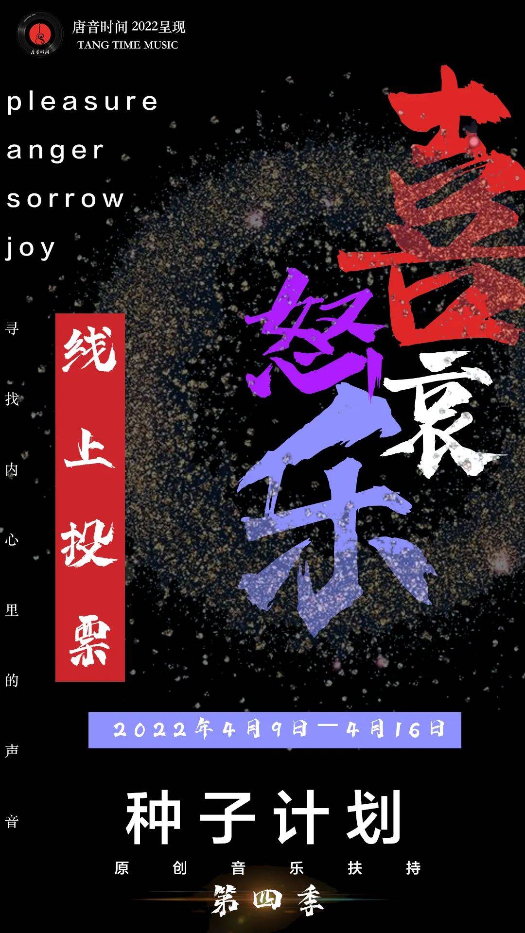 本次《种子4》为命题创作,征集的音乐作品在“喜怒哀乐”四种不同情绪中都有着不同的表现,其中不乏有音乐人把每一种情绪都创作成歌,从创作的热情中可以看得出来,每一份用心都值得被肯定,每个主题中我们精选出了相对比较符合要求的音乐作品,正式进入线上投票的环节,期待为你喜欢的作品来进行投票打CALL,用你的行动来支持他们!