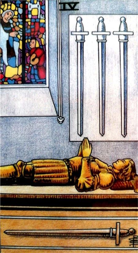这张牌表示,你们之间的感情正在经历一段比较消极的时期,并不是你想的那样缘分已尽,其实宝剑四这张牌也代表了稳定,只不过由于风元素的过于理性,才会让你有一种缘分已尽的感觉。所以对于这段感情切勿急躁,一切慢慢等待即可。
