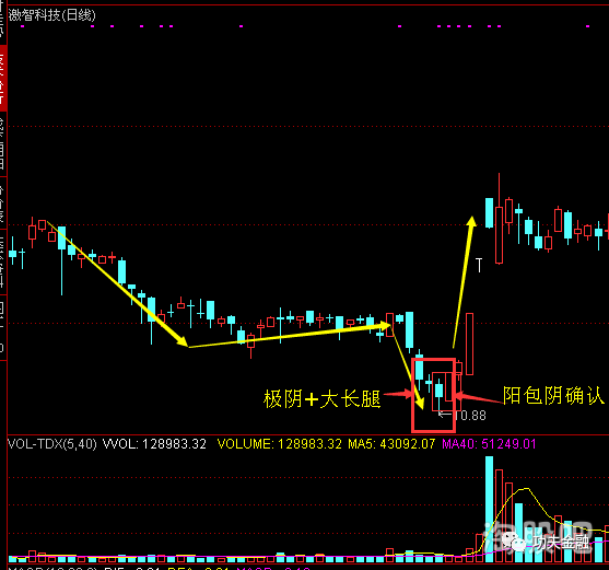 3、依米康的走势如下,有两点大家留意:第一次大阴大长腿,没有确认,所以不是买点;极阴大长腿,有阳吞阴确认,所以买点出现。