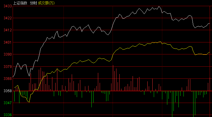 下午估计大盘还有震荡回落补量的需求。当关注:大盘能否收在3400点之上?成交量能否超过昨日,达到8000亿?