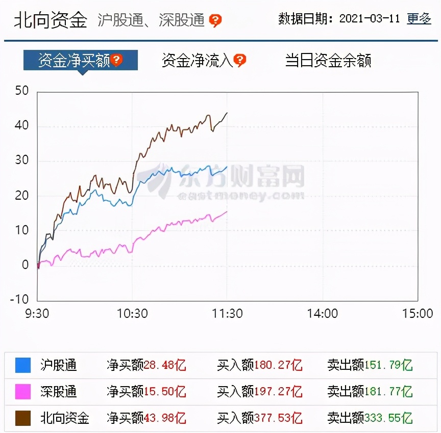 【北向资金加速流入 净流入超40亿元】北向资金早盘加速流入,截至目前,净流入43.98亿元。