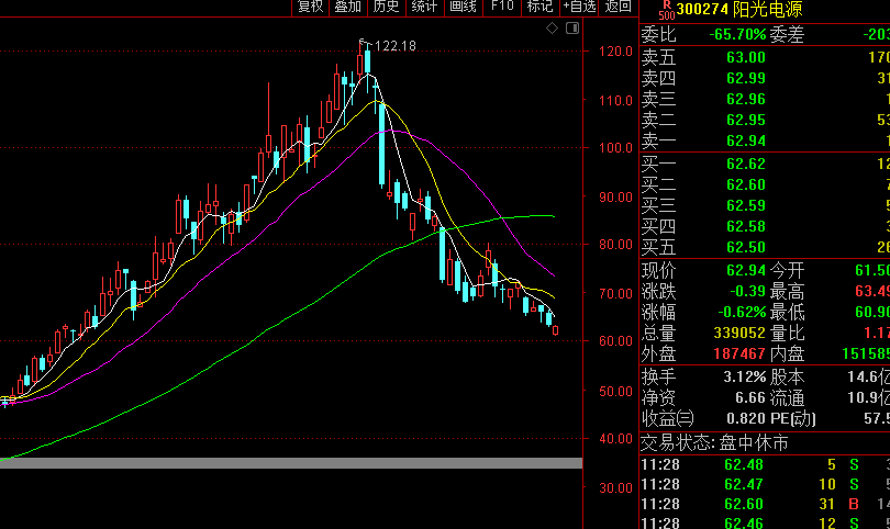 阳光电源:最高价122.25元,现价63.33元,距离腰斩还差2元。