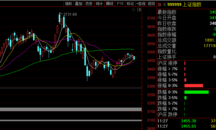 今天上午大盘低开7点3475点即为最高点,探低3451点,午前收3456点。上证50、沪深300、上证综指、中证500、深成指、中小板、创业板、科创板分别收-1.52%、-1.30%、-0.74%、-1.02%、-1.10%、-1.32%、-1.24%、-1.03%。个股涨跌比:659837,10521195,有42股涨幅超10%以上,跌幅10%以上的个股有7只。今天上午成交量4280亿,延续缩量。