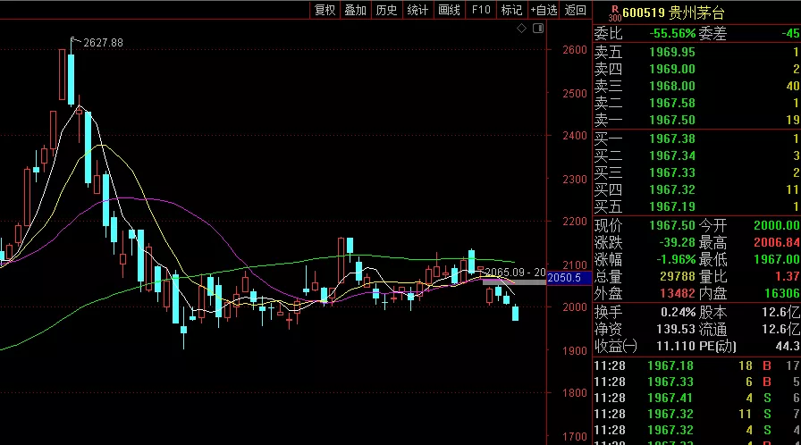 今日长假后首日交易,由于节前退出和观望资金奋力入市建仓,大盘一度大涨25点。但是,由于茅台大跌至1967元,并且“茅股”药明康德、迈瑞医疗、爱尔眼科、天赐材料、比亚迪、金龙鱼、宁德时代等大跌,致使深市最多跌2.43%,创业板大跌4.4%,最终拖累了沪市也由长时间红盘变为午前跌0.22%,沪市的成交量只比深市少400亿,显示上午A股是沪强深弱。
