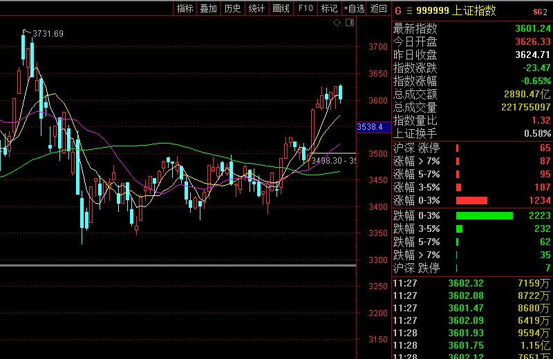 今天上午大盘冲至3629点就难以上行,券商、白酒带头跳水,黄线在上白线远离在下。指数两波跳水至3592点,午前勉强收3601点,大盘继续围绕着3600点震荡洗盘。