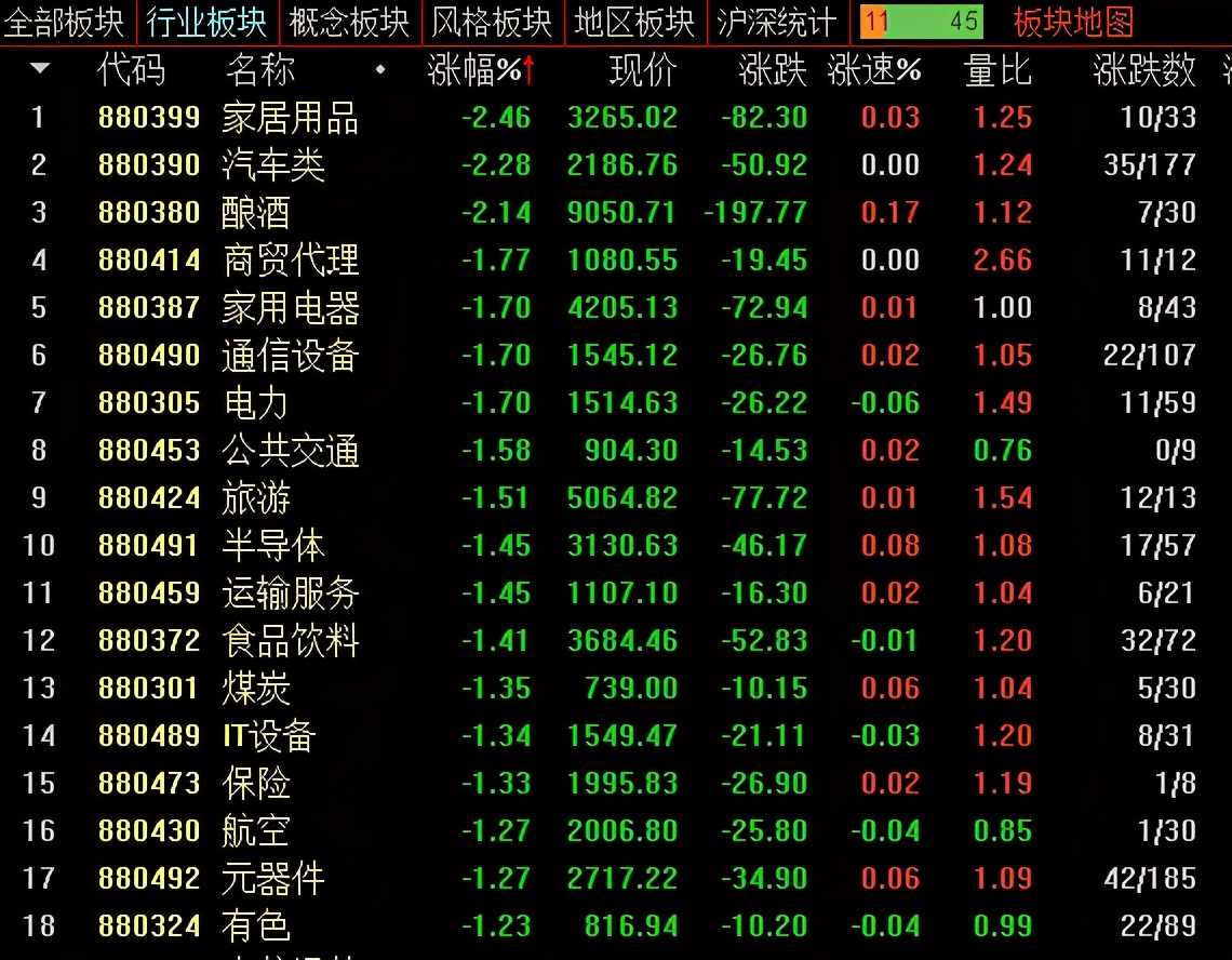 早盘A股各指数一路走低,贵州茅台、银行等权重股走弱拖累指数,上证50指数跌超1%,创业板指相对强势,冲高回落险守3400点,两市约3000家个股下跌,资金风险偏好降低。半导体芯片、新能源车等近期热点题材调整,昨日大涨的猪肉股、电力股集体回调,煤炭股继续走低,白酒股走弱,洋河股份大跌5%,而华为昇腾概念、国产软件早盘走强,医美概念继续超跌反弹,有机硅、服装家纺逆势拉升。盘面上,有机硅、服装家纺、旅游涨幅居前,第三代半导体、汽车整车、光刻胶等跌幅前列。
