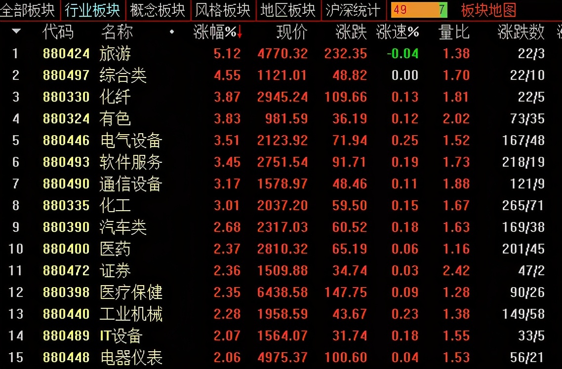受此利好鼓舞,今天上午八大指数全线大涨,创业板和深成指涨幅最大,分别为3.95%和2.39%。两市个股涨跌比为2877:900(3:1),带领大盘重返五周均线3546点,重回多头市场。尤其是上午的成交量就达到8509亿,为今年来半日最大成交量,估计全天成交量将达到1.2—1.3万亿,表明市场对后市的信心。