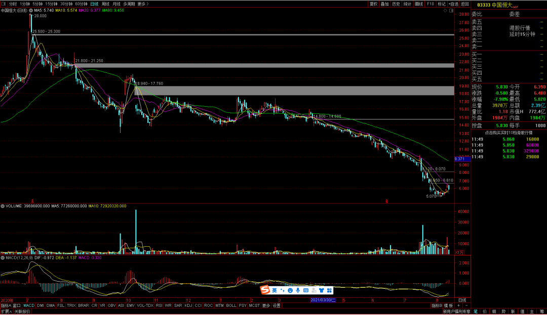 【中国恒大跌幅扩大至7% 债券同步普跌】中国恒大短线下挫,跌幅扩大至7%;恒大系债券普跌,19恒大01跌逾10%,15恒大03跌逾6%,20恒大01跌超3%。据央广网报道,恒大昆明两个项目停工。一份显示为重庆建工集团股份有限公司恒大金碧天下二期隽翠苑工程项目部的停工公告称,“因恒大欠我司工程款长期未拨付,同时金额较大的商业承兑汇票逾期不兑付,欠付款总金额超过2.1亿元。……被迫停工”。除恒大金碧天下外,恒大昆海湖业主也表示,昆海湖也已经停工。