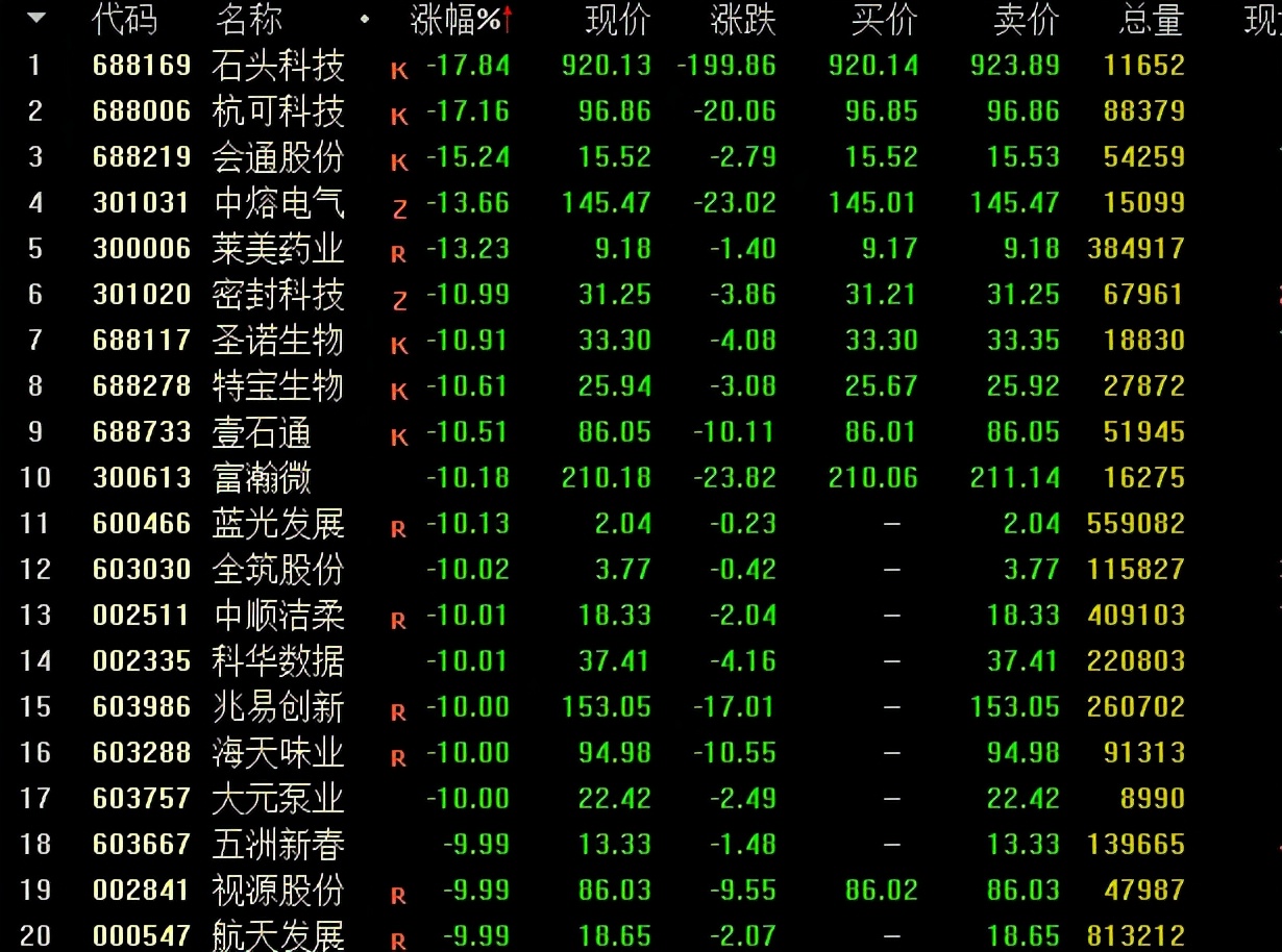 因此,今天上午以贵州茅台为代表的老抱团股,和以宁德时代、比亚迪、隆基股份为代表的的新能源汽车、芯片、光伏等新赛道股,集体大幅回调,大盘一度跌破3500点(3496点)。个股涨跌比为1297:2599,基本为1:2。成交量9183亿,比昨日少1021亿,午前险守3501点。科创板、创业板跌幅最大,为2.8%和2.51%。
