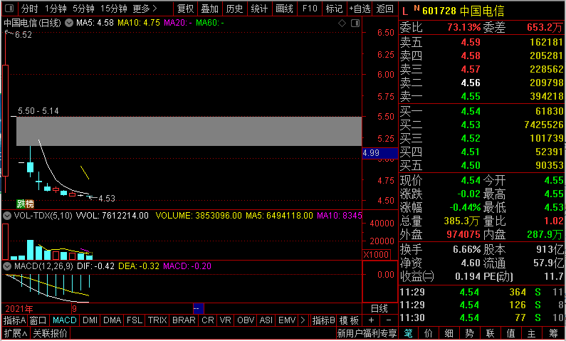 【中国电信盘中触及发行价】中国电信上市以来持续走低,今日盘中触及发行价4.53元,该位置有超740万手“绿鞋机制”护盘。